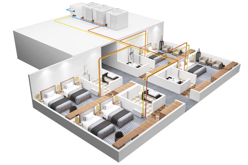 適用于家庭、別墅、學校、政府機關、洗浴中心、度假中心、醫院等場所,當建筑面積比較大時,可在一定規模內使用多臺空氣源熱泵并聯運行解決建筑冷暖負荷。