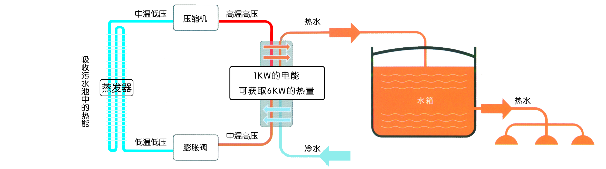 污水能熱泵的制熱原理稱之為逆卡諾原理、利用工質(zhì)在吸熱裝置內(nèi)氣化吸收污水中的熱量(低品位熱能)、通過少量電能驅(qū)動壓縮機把工質(zhì)壓縮成高溫氣體(高品位熱能)進(jìn)入放熱裝置內(nèi)、把吸收的熱能及本身所有電能轉(zhuǎn)變的熱能給水加熱。